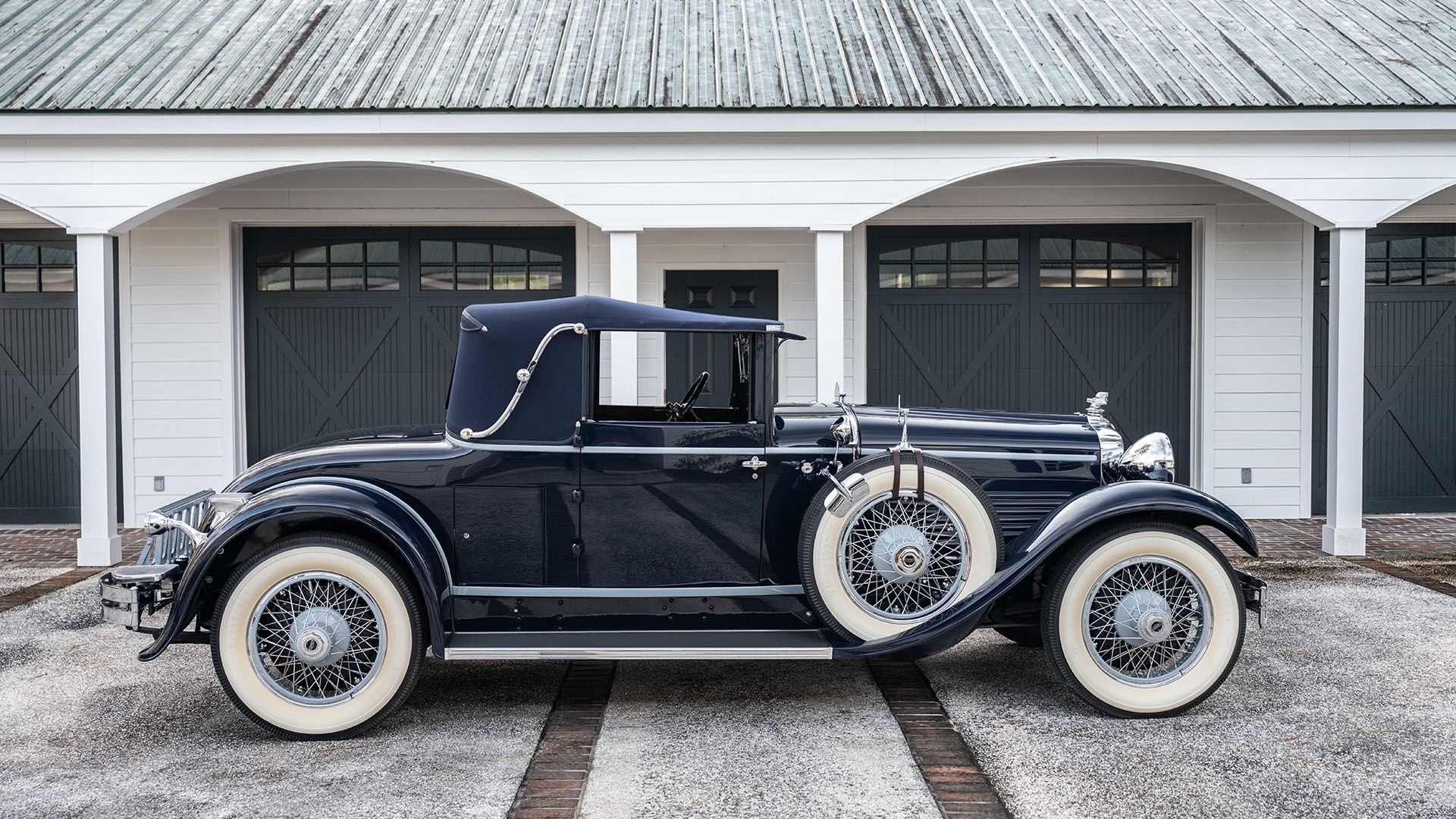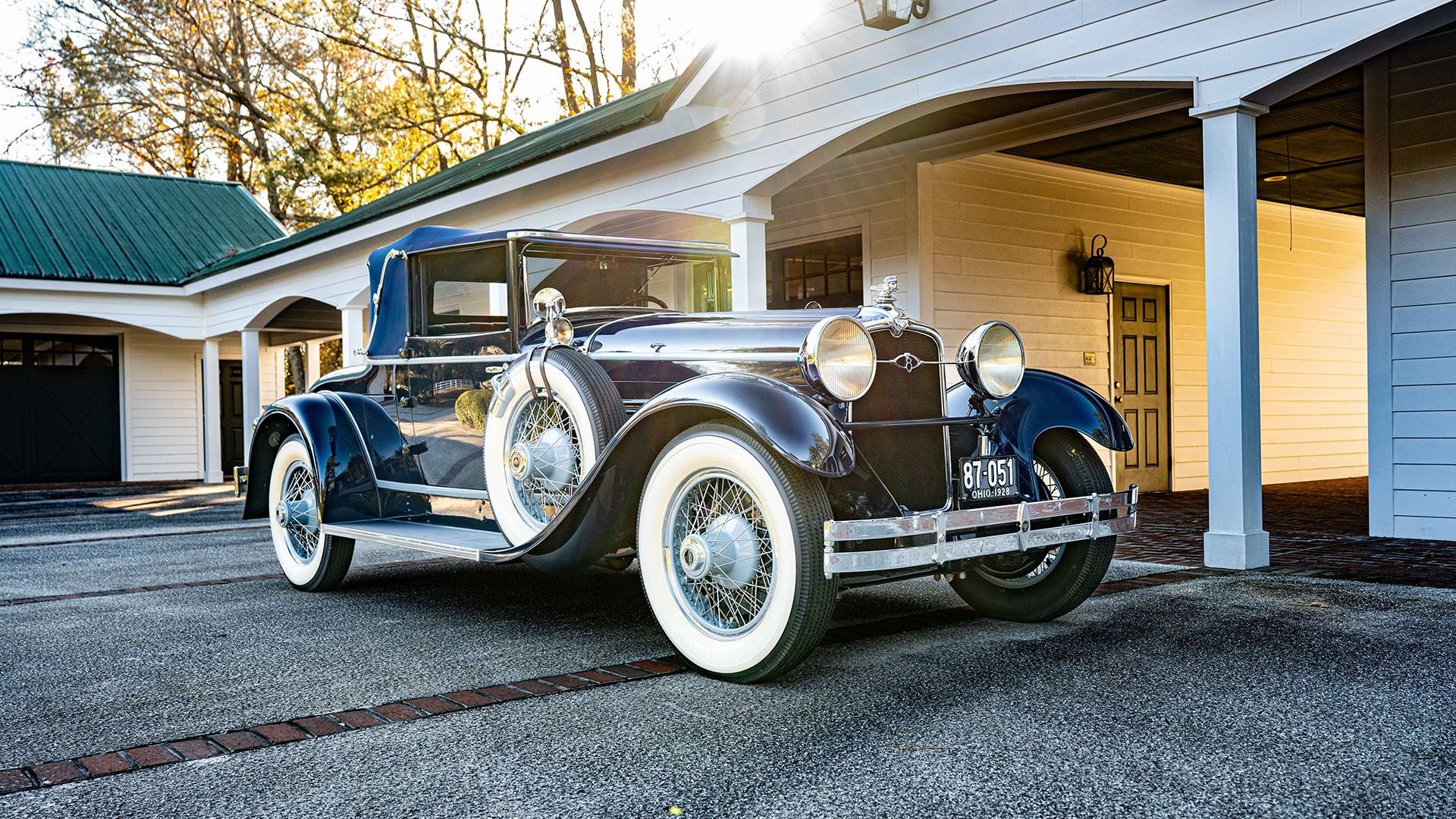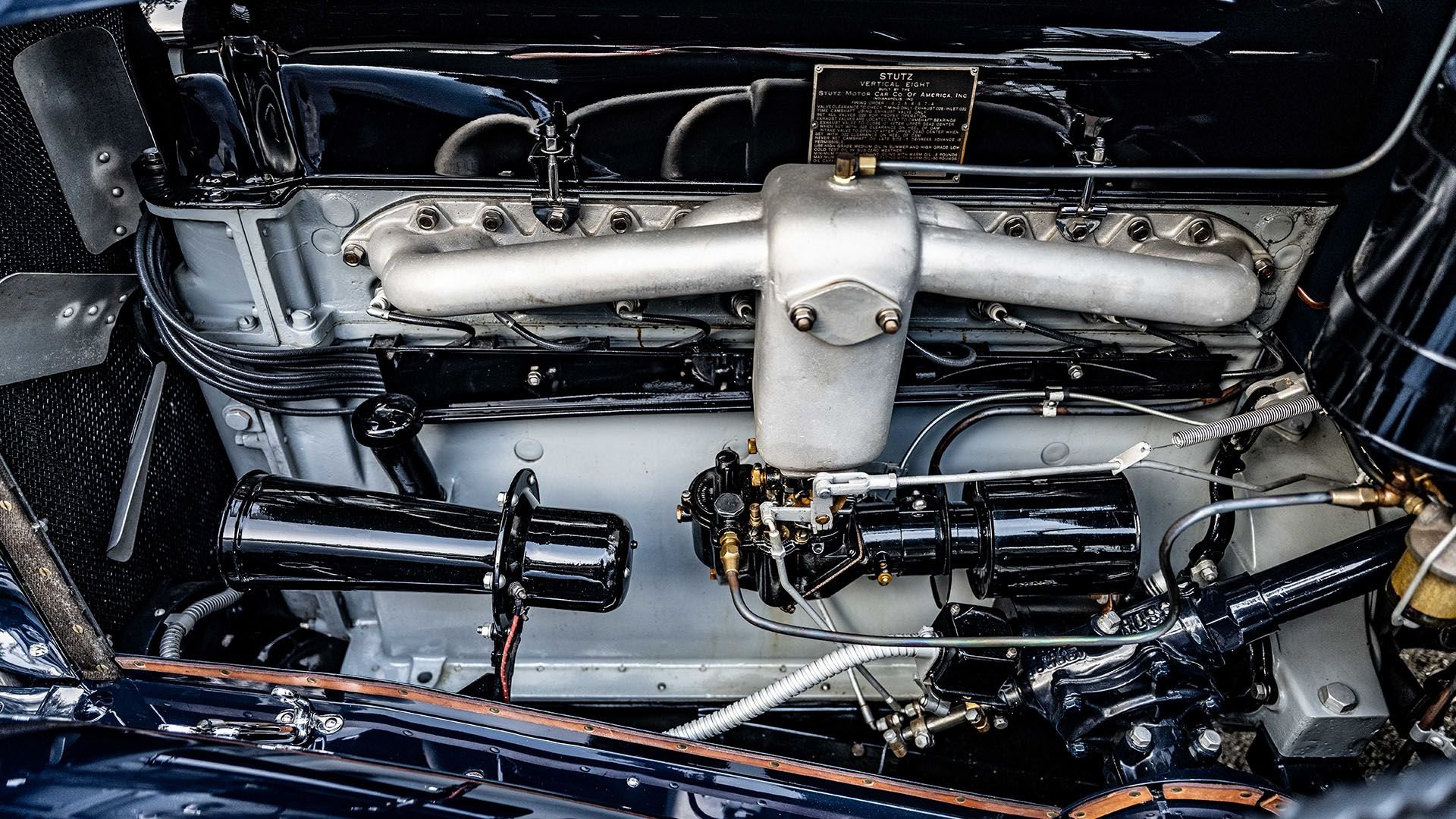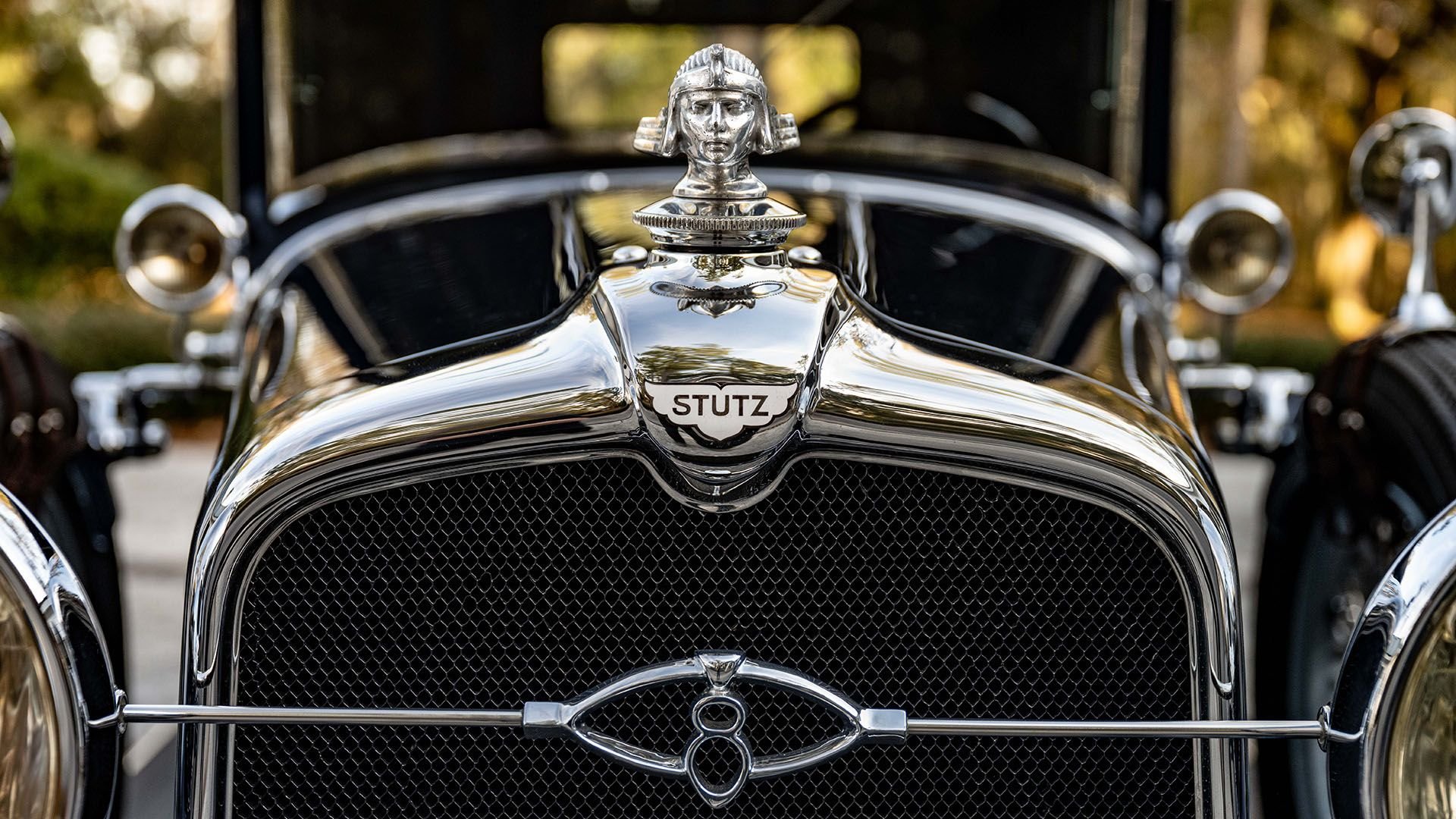L'une des marques légendaires de l'histoire automobile américaine est la Stutz, construite à Indianapolis, dans l'Indiana, de 1911 à 1935. L'entreprise s'est forgé une réputation lors des '500' d'Indianapolis. Elle a renforcé cette réputation avec une série d'automobiles à la fois sportives et luxueuses. Les Stutz ont toujours été des voitures rapides – et elles étaient chères. Ce coupé convertible (avec carrosserie de Phillips Body de Warren, Ohio) coûtait 3 700 $ à l'état neuf. Une Stutz Black Hawk était la voiture de production la plus rapide d'Amérique en 1928, atteignant une moyenne de 106,53 mph à Daytona. Le châssis Stutz BB Vertical Eight de 1928 était propulsé par un moteur à huit cylindres en ligne qui développait 110 chevaux.
